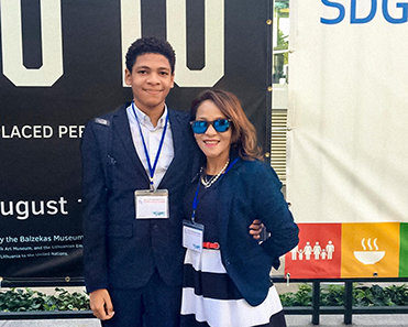 Moeder en zoon, mensenrechtenactivisten en onderwijzers, omhelzen de JvMR campagne.